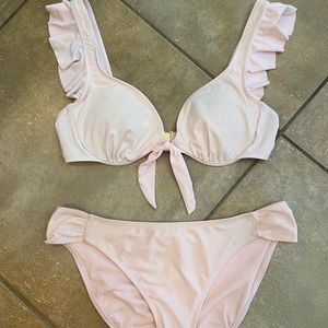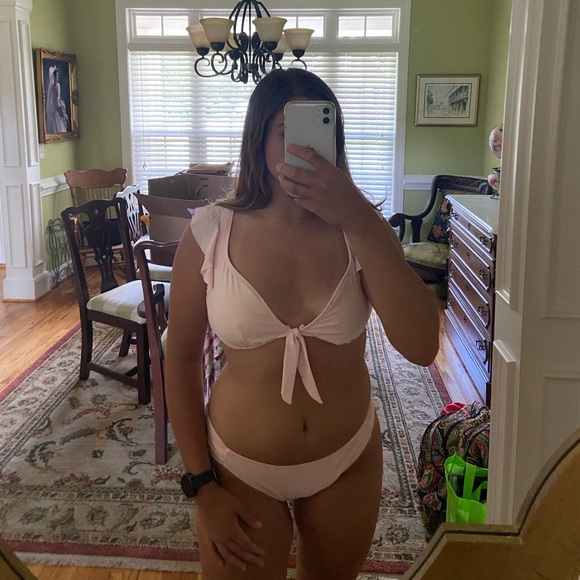 I love this bathing suit so much! The ruffle detailing on the straps are super cute and it has a really nice gold clasp in the back that is super durable. The bottoms are full coverage/ like how bathing suits USED to be lol. The only thing is that there are small black dots on the back of the bottoms but it’s not noticeable at all when it’s on, just when you look upclose. The bottoms are XL!