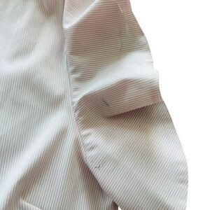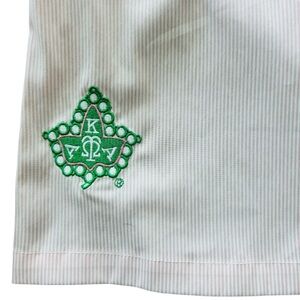 Light pink and white, striped ruffle one shoulder top. This is a perfect top for a business casual meeting and features an Alpha Kappa Alpha Sorority, Inc. patch on the bottom corner. This top does have a small stain on the ruffle sleeve that you should be able to get out with the right products.