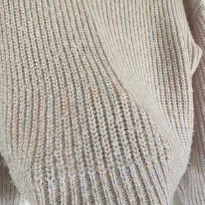 Elevate your cozy style with this beautiful light pink knit sweater from Express. The soft, delicate pink base is woven with subtle, shimmering sparkles for a touch of glamour. This sweater features a unique, folded-over turtleneck design, creating a chic and comfortable cowl neck silhouette.