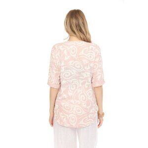 Spiral print features 3/4-length sleeves and a button-down design, making it the perfect addition to your wardrobe. This versatile piece is made with high-quality linen, ensuring a comfortable and stylish fit.