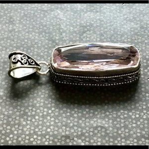 Fabulous light pink colored Topaz! Facet cut for more light and sparkle. Beautiful, intricate vintage style setting. Gemstone alone is 1.7/16”H x 1/2”L. The pendant is 1.3/4”H w/o the bale, and 2.3/16” width. Artisan Made. 925 Sterling silver.
