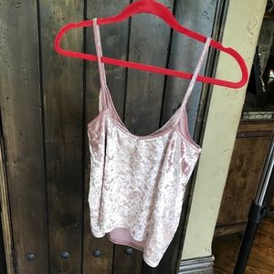 Light pink crushed velvet tank. It's a bit shorter than it looks in the picture. Only worn a couple of times and is in excellent used condition.