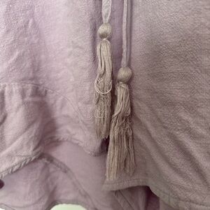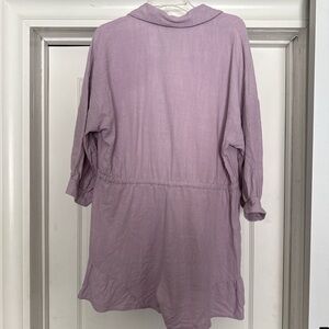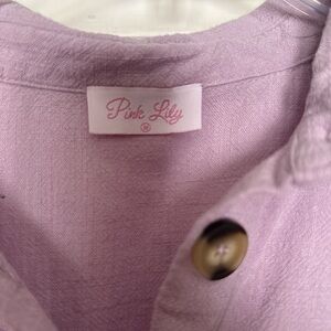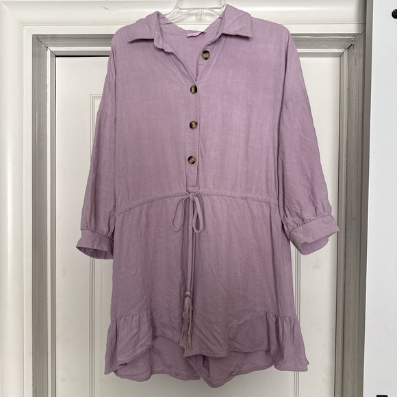 Light lilac tunic with a soft woven texture. Button-front closure and a simple neckline. Casual, feminine look suitable for hot summer days. Subtle wooden-tone buttons for contrast. Fits oversized.
