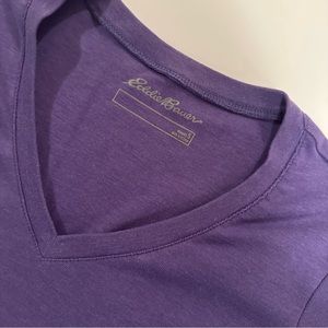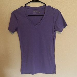 Photos are with and without flash! Soft purple Eddie Bauer classic T-shirt with a V-neck. Women’s size small.