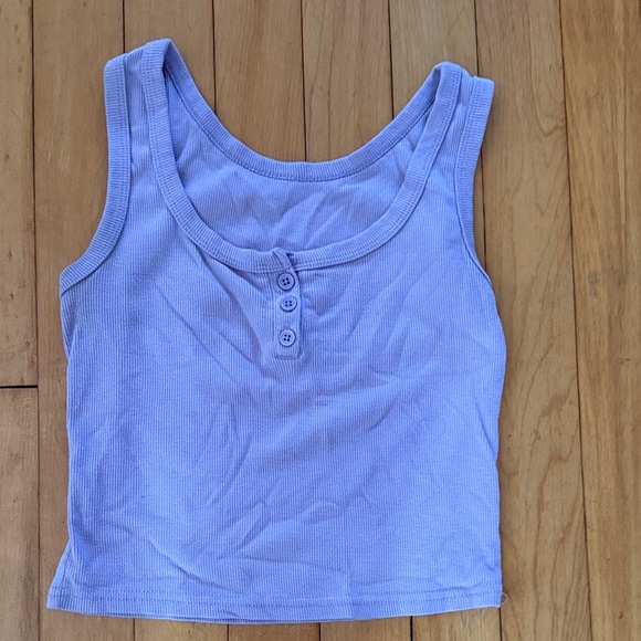 Stylish light purple ribbed tank top with button details.