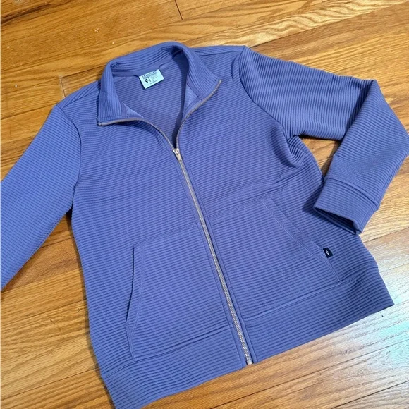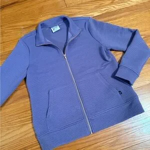 Stylish light dusty purple color, ribbed textured, light weight zip-up jacket. Features a full front gold tone zipper and two pockets. Barely ever worn. 20 inches from pit to pit, 23 1/2 inches from shoulder to bottom. Perfect for adding another layer of warmth.