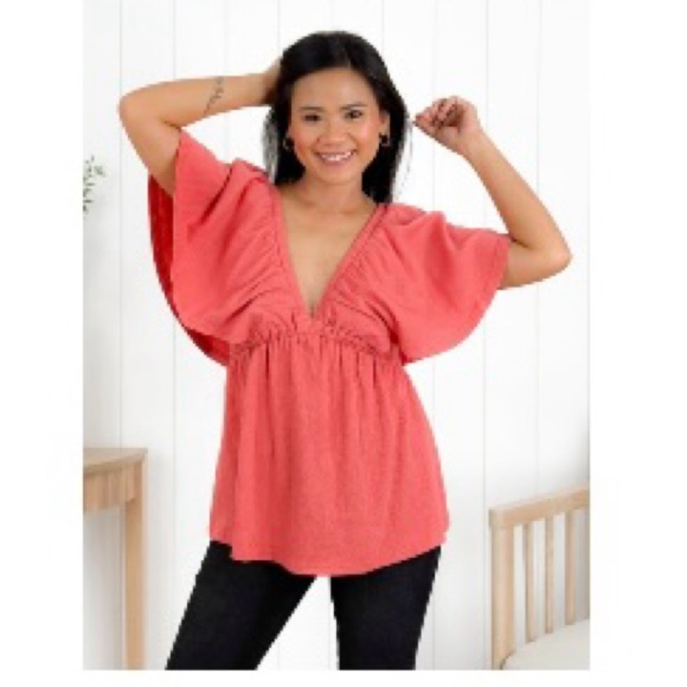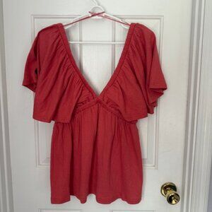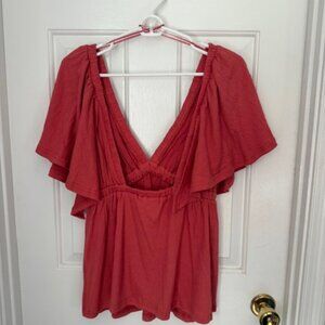 NWOT. Size small. Light rust V neck Top, with open back and flutter sleeves. cinches right under bust.