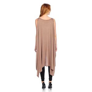 Versatile in many ways, this Convertible Tunic works as a great transitional piece of clothing to adds to your collection. With the use of spandex in its fabrication, this tunic is incredibly flexible and can be adjusted to almost any size. You can wear it in multiple ways by simply turning and folding the silhouette around your body. The asymmetrical hemline hangs delicately from your shoulders, leaving mild pleats all around. You can modify this piece to wear in the form of a belted tank top, a vest, a dress, or simply a halter top. Taupe is currently out of stock. Images are to demonstrate the different ways to wear this Convertible Tunic Top New in Package. Please see size chart for best fit. Please ask any questions. Thank you for shopping with Curvy Posh.
