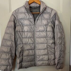 Lightweight quilted puffer with a subtle silver sheen. Full zip front and stitched baffle design. Stand collar for added warmth. Clean, versatile layering piece. 80% down. Super warm, super light and extremely pack able and layerable. Washable.