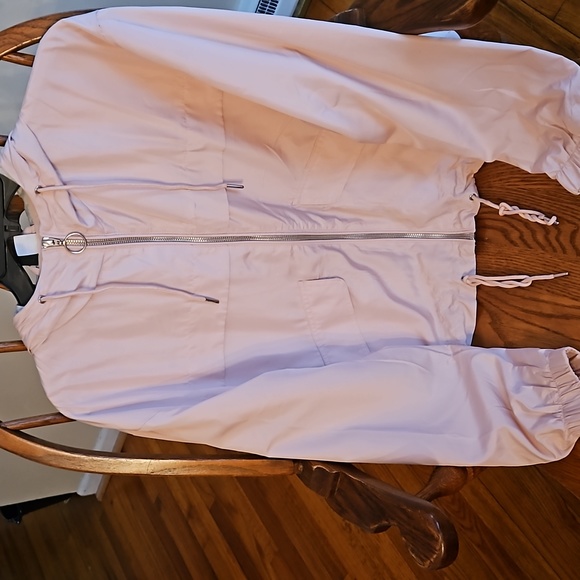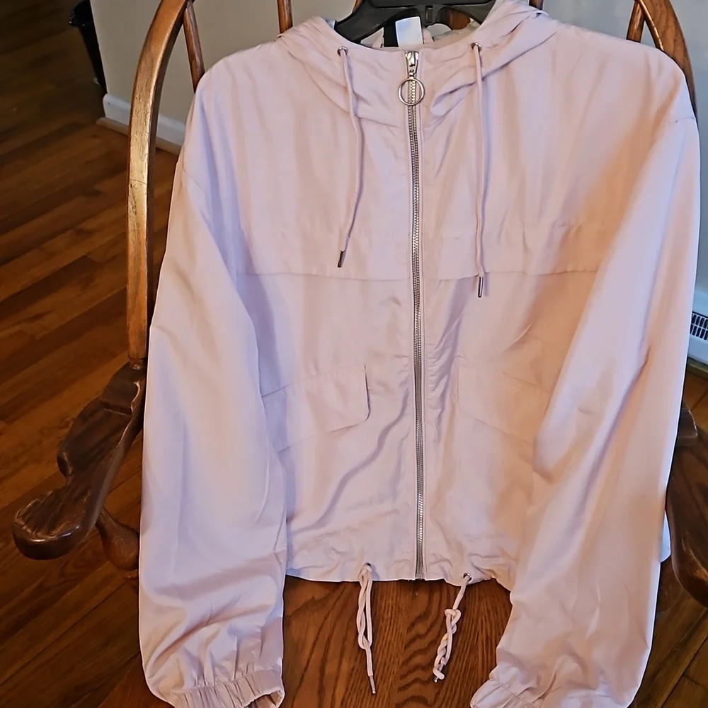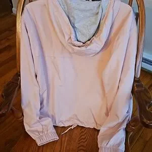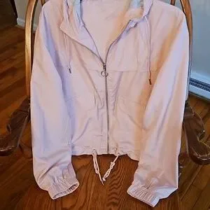 Light baby pink spring jacket with pockets and a light grey hood