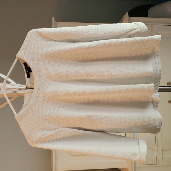 Very Light material for a sweater. Sleeves 3/4 length. White with a unique pattern. Zipper in back. Can dress up for business or going out!