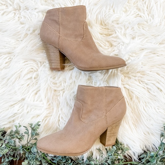 Light Tan booties from Forever 21. Unique fabric print! Faux suede material. Zipper to outer sides. Pointed Toe. 3.5 inch heel.