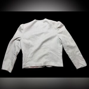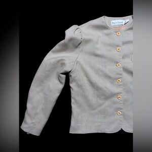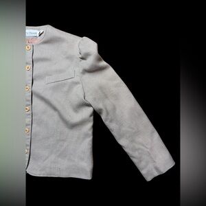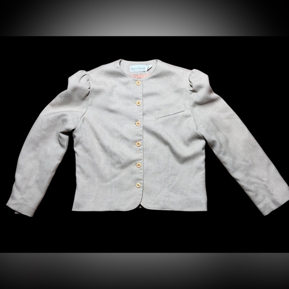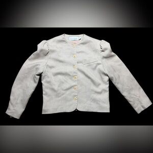 Classic boxy jacket with front buttons. Subtle puff shoulders for a tailored look. Single faux chest pocket. Neutral light tan color works with many outfits. Vintage 90’s. I love the sleeves on this jacket! In like new condition even though vintage. No rips or spots. Measurements included in pictures. 18 1/2 inches pit to pit, 19 1/2 inches long.