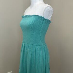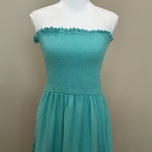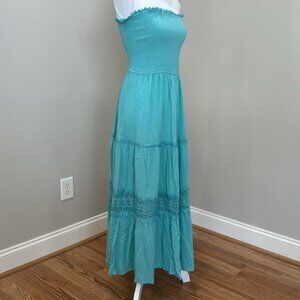 Light Turquoise Blue Strapless Maxi Dress with Smocked Bodice and Full Skirt. Delicate ruffle hem. Lace detailing on skirt. Perfect condition.