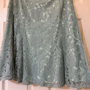 Cute lace skirt, light turquoise, flattering knee-length and perfect for Easter! Zipper and clasp at side. Sits at waist. Great condition! Pairs perfectly with light turquoise shirt and bright turquoise silk blazer in my closet! Bundle at a reduced price! Size 14 or Large. True to size.