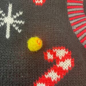 Festive unisex light-up Christmas sweater featuring a colorful Nutcracker drummer with candy canes, pom-poms, and LED lights that actually work (tested and functional). Perfect for holiday parties or ugly sweater contests!