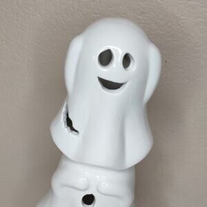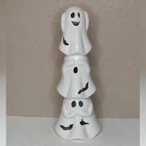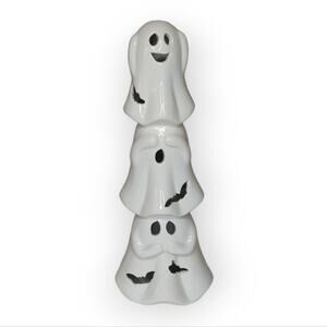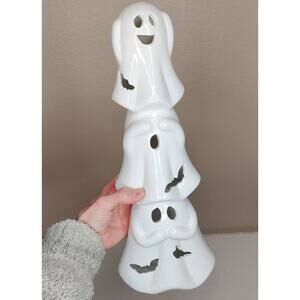 Light Up White Stacked Ceramic Ghosts Trio Hear No Evil See No Evil Speak No Evil Tabletop Halloween Figurine Decor with cut out Bats
