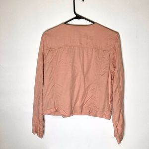 Sanctuary brand, dusty salmon color, light material, diagonal zip-up detailing in front.