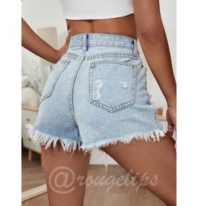 Light Wash Blue Denim Shorts Distressed Ripped High Waist Raw Hem