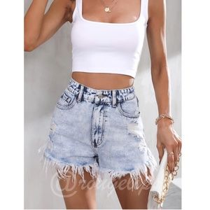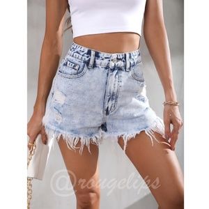 Light Wash Blue Denim Shorts Distressed Ripped High Waist Raw Hem