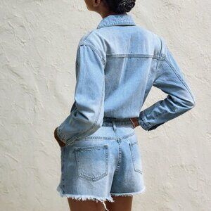 Light Wash Casual Women's Denim Bib Pants Long Sleeve Romper Jumpsuit