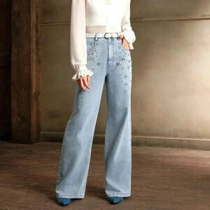 Light Wash Casual Women's Hand-Stitched Rhinestone Jeans