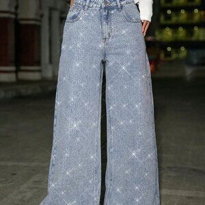 Light Wash Casual Women's Rhinestone Studded Low Waist Baggy Jeans with Glitter