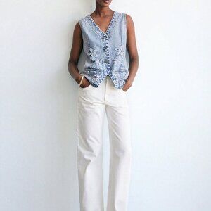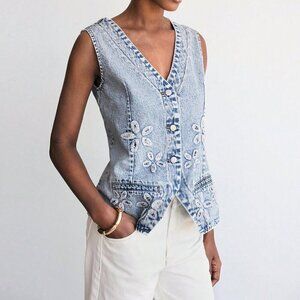 Light Wash Casual Women's Washed Floral Pattern Front Button Denim Vest