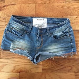 Lightly worn, light wash, frayed denim cutoff shorts from Dollhouse. Cute brown stitching along the bottom of the shorts in both the front in back.