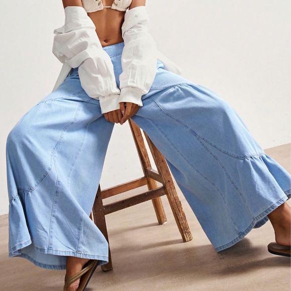 Light Wash Solid Wide leg Stretchy Waist Denim Jeans Pants