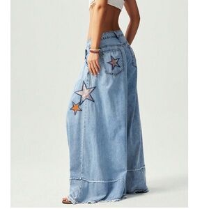 Light Wash Star Patch Wide leg Frayed Detail Denim Jean pants