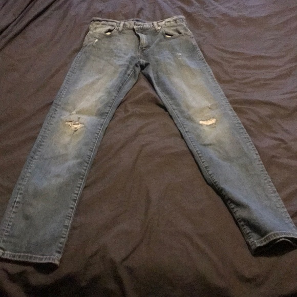 Light washed, stretchy blue jeans! Worn a couple of times no signs of wear. Factory distressed at the knee super fashionable.