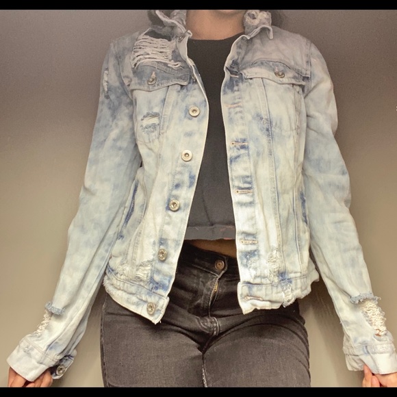 Light Washed Ripped Jean Jacket With Pink Flowers on the back