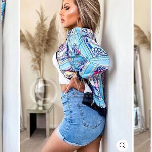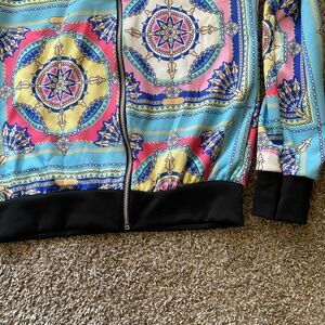 Colorful and Fun, Light Wear Bomber Jacket, Paisley Chain Print, Blue, Pink, Yellow. Zip Front, long Sleeve, no pockets, Ribbed Hem and cuffs. Casual, soft and stretchy
