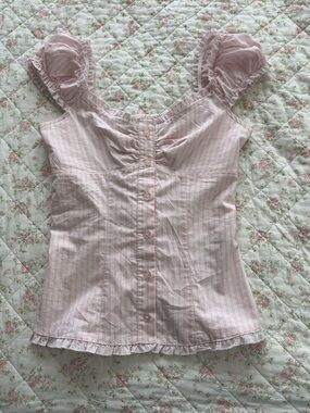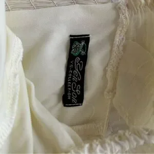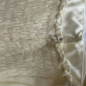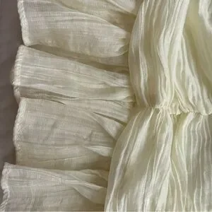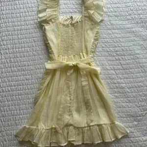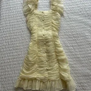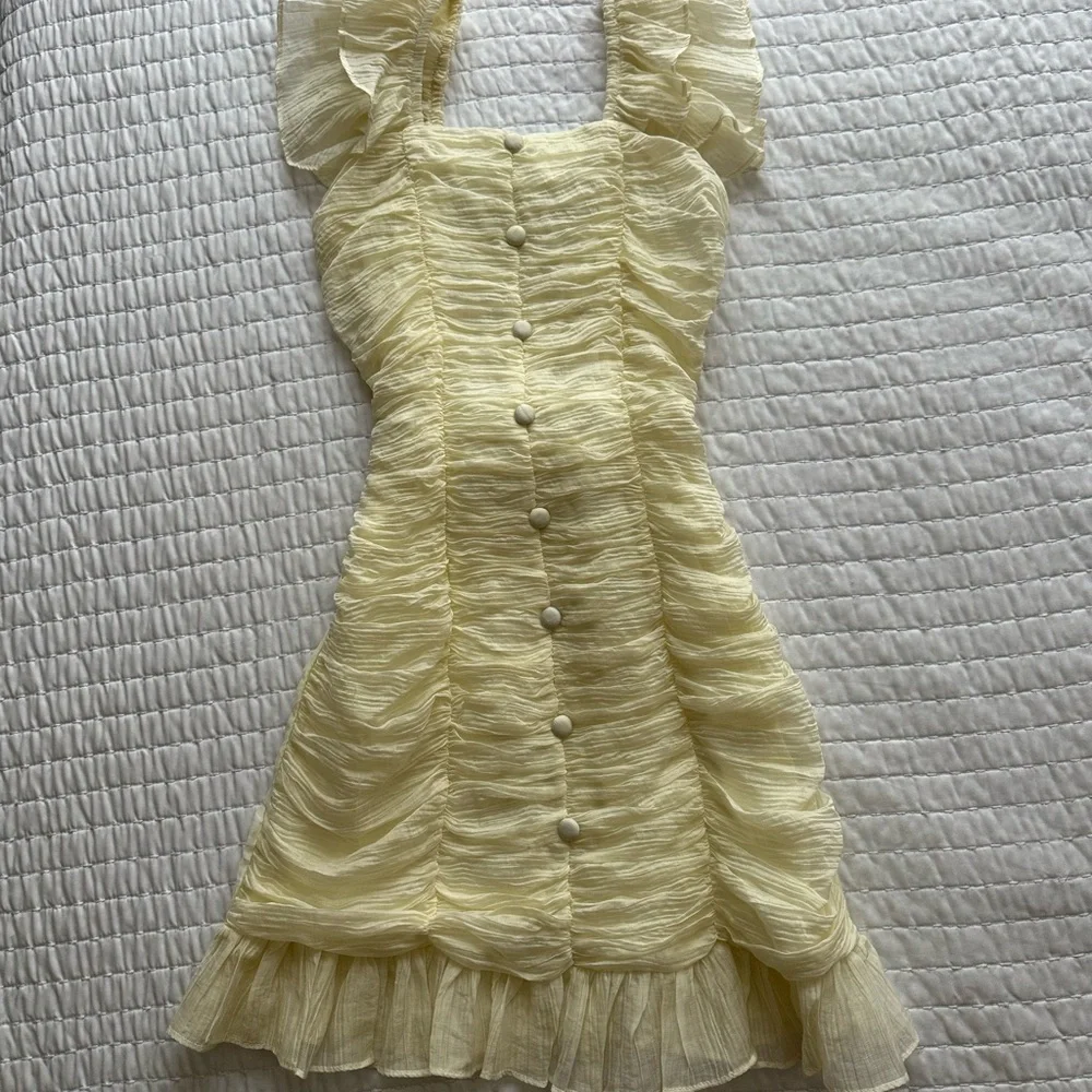 Lightweight pale yellow mini with textured crinkle fabric. Square neckline and ruffled puff straps. Covered front buttons down center. Fitted waist and flared layered ruffle hem. no size but fits like a small