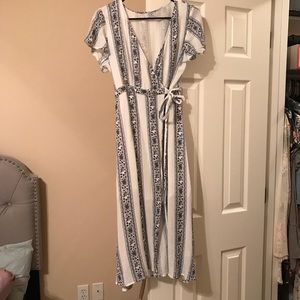 Wrap dress that comes to about knee length, shrunk a little so I think a extra small/small would fit this best. Really comfortable!