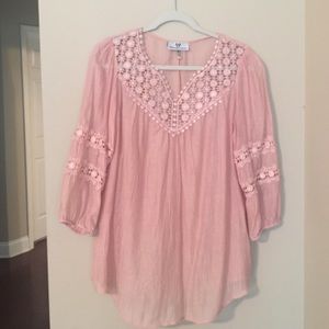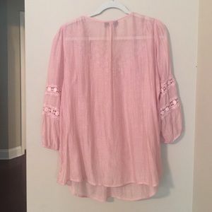 Pink, handkerchief thin , delicate blouse. Dress up or down. Must wear undershirt.