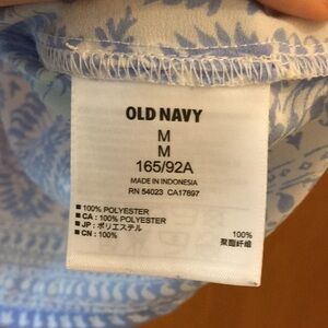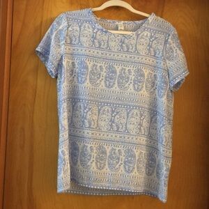 This blue and ivory patterned blouse has short sleeves. It’s very light and airy (semi sheer)