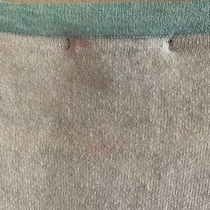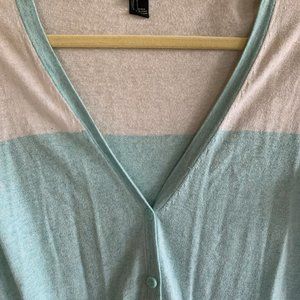 Very comfy light blue/teal cardigan. Slouchy pockets, button up. There is a faint red/pink stain in the back by the tag. Not really noticeable especially if your hair or ponytail is covering it.