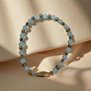This handmade bracelet is pretty and dainty. Blue light bi cone beads with spacer beads. Locking clasp. 7 inches.