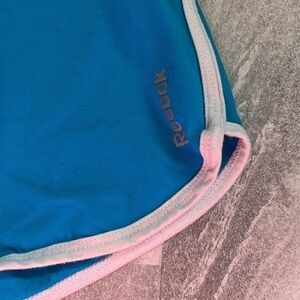 Used but very good condition, Light blue hot shorts 3” Reebok size medium. From top to bottom measures 10”. White piping along bottom, 92% cotton. 8% spandex. Elastic waist.