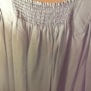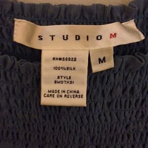 Light blue. Sleeve runs past elbow but doesn't reach to wrist. 100% silk. Love the style but was too big on me.
