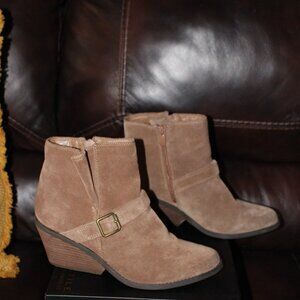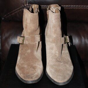Tan Suede, Semi pointed toe, side zip, with strap across top of foot with Brass toned buckle