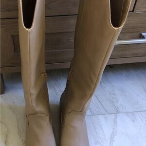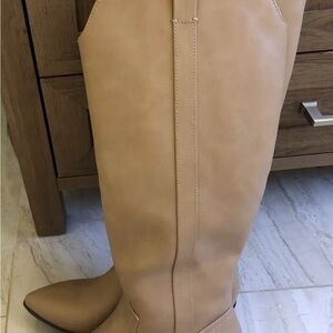 Elevate your shoe game with these stylish and comfortable boots from Universal Thread. These knee-high Western boots come in a light brown color and feature a pointed toe and a pull-on closure for an easy and comfortable fit. The boots have a solid pattern and are made with a faux leather material that is perfect for any party or casual occasion.