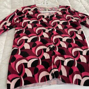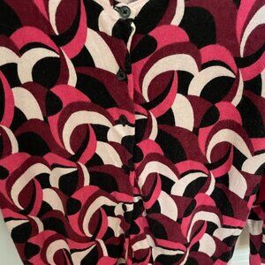 Button-down front and 3/4 sleeve. Round, lowish neckline. Waist length.