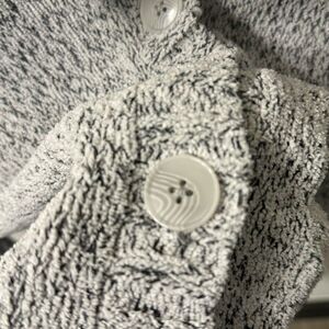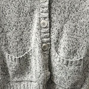 Light gray heathered cardigan, thick and soft material. Can be worn buttoned up or open. Two open pockets on front