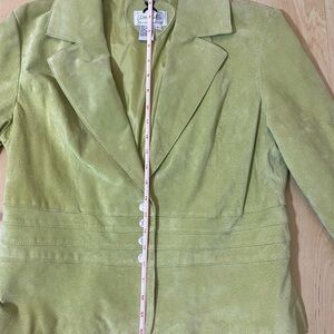 Beautiful celery green suede long sleeve jacket. Size L, 100% leather and fully lined in 100% polyester. Snap closures at waist and sleeves. 25” L, 24” sleeve length, and 18” bust. Gently used, no tears or discoloration.