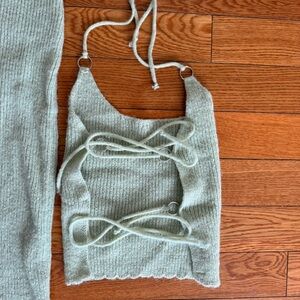Stretchy rib knit set with midaxi skirt and crop top. The top ties in the back and can be tied multiple ways. Worn twice. Has one small brown stain as shown in the picture.
