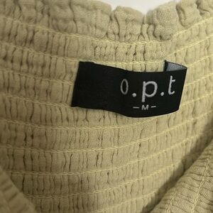 Worn once, dress is super comfortable and smocked. No signs of wear or damage, purchased from Few Moda, this is the o.p.t. Frankie dress. Color is a light pea green