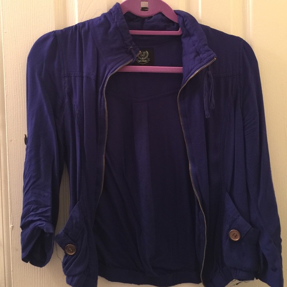 Jacket is like new, in perfect condition. Sleeves can be rolled and buttoned halfway, in-buttoned making the cuffs rest just above your wrist. The color is royal blue, with 2 pockets, a button on each pocket and on each sleeve. The bottom of the jacket has elastic to tighten the ends of the jacket